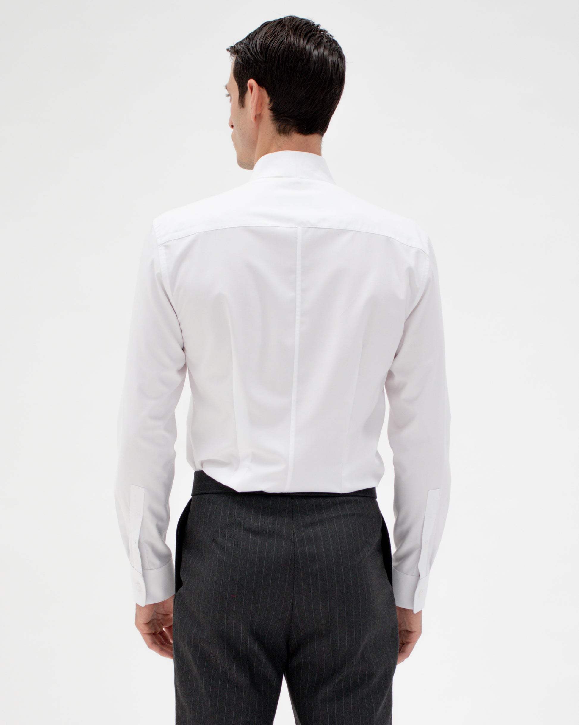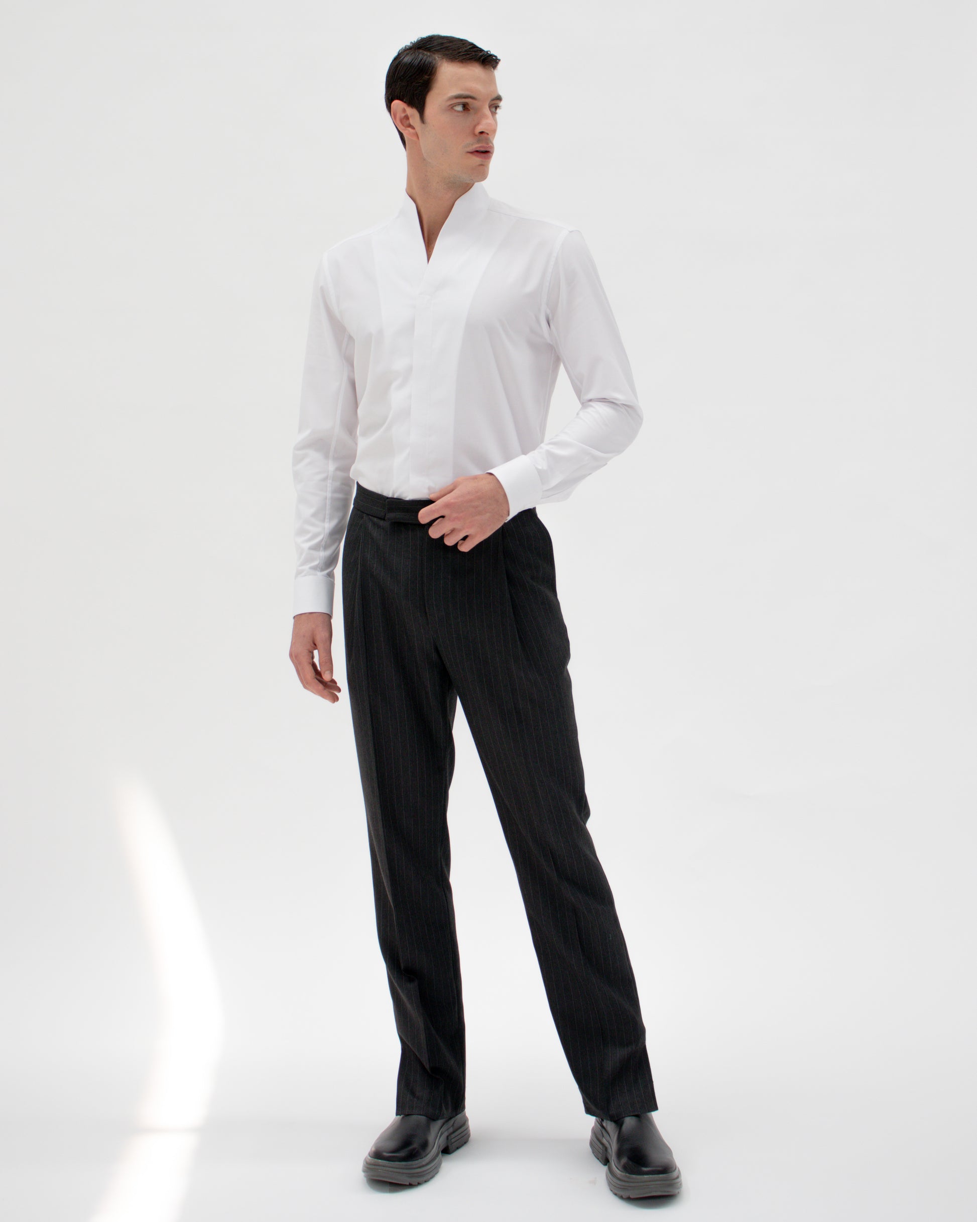 Our classic shirt features a bold chimney-type high collar that elongates the sillhouette and adds character. Hidden fastening allow the clean lines of the collar to stand out in a bold sillhouete where a tie turns unnecesary