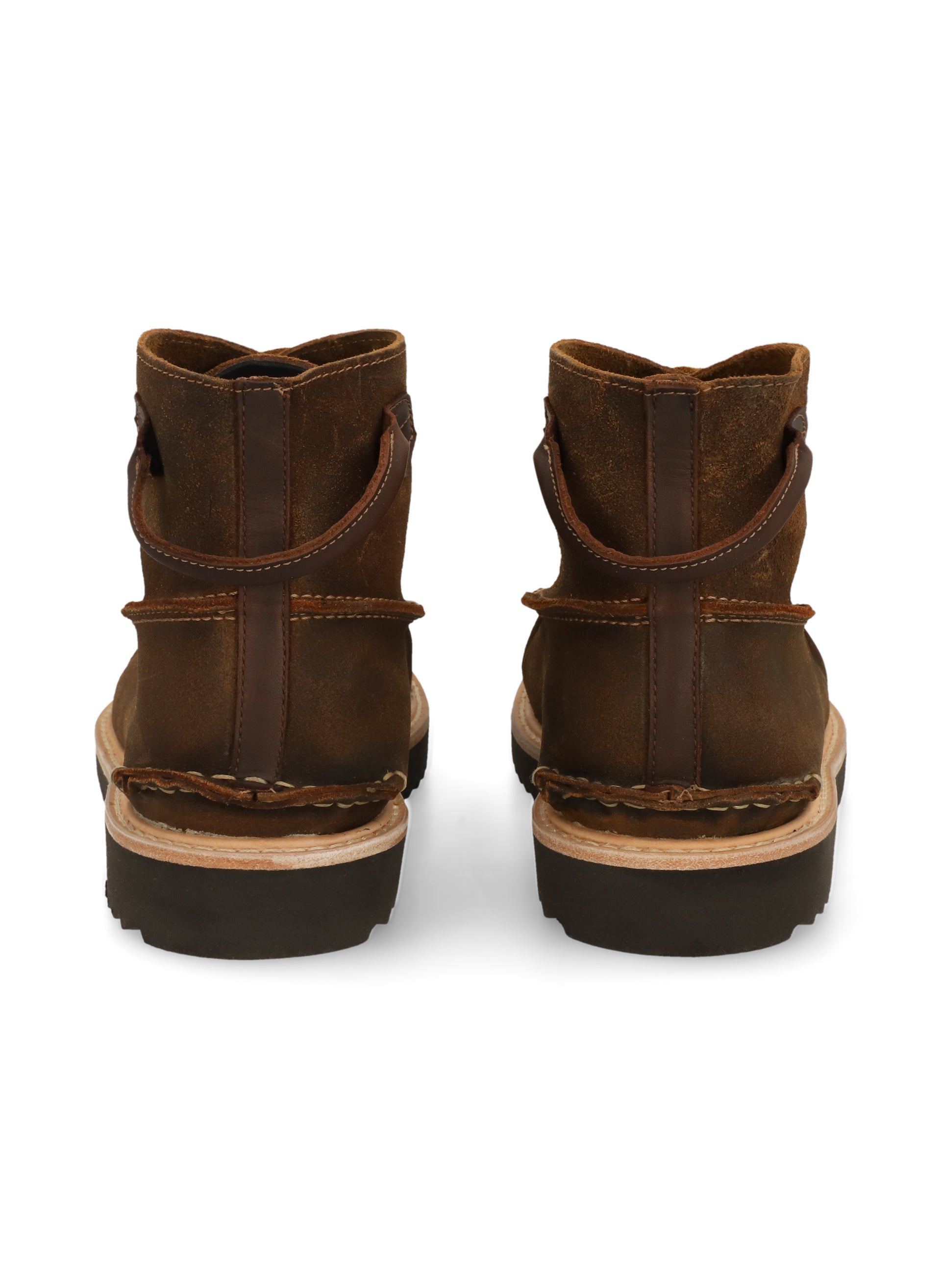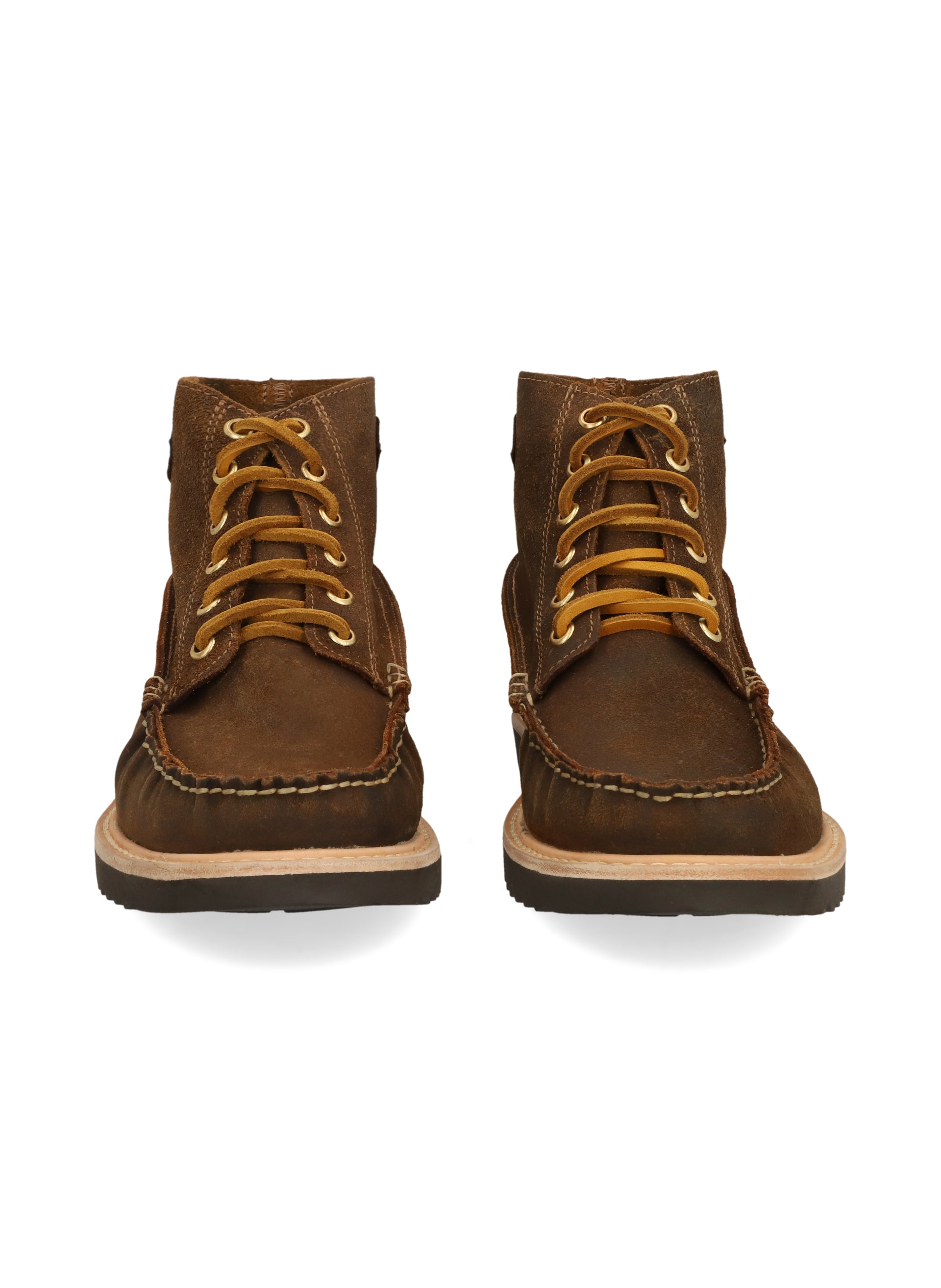 - Estilo: Moc Toe, de caña corta en gamuza, con costuras curvas en puntera, cinta trasera de cuero, ojillos metálicos con agujetas de Cuero color mostaza.